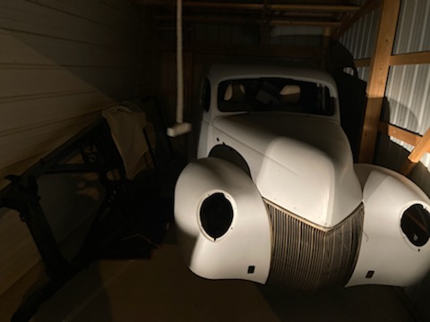 • 40 Ford frame with Chassis engineering MII front, disc brakes, power rack and pinion, modified transmission crossmember (engine and trans not included)…on shop wheels