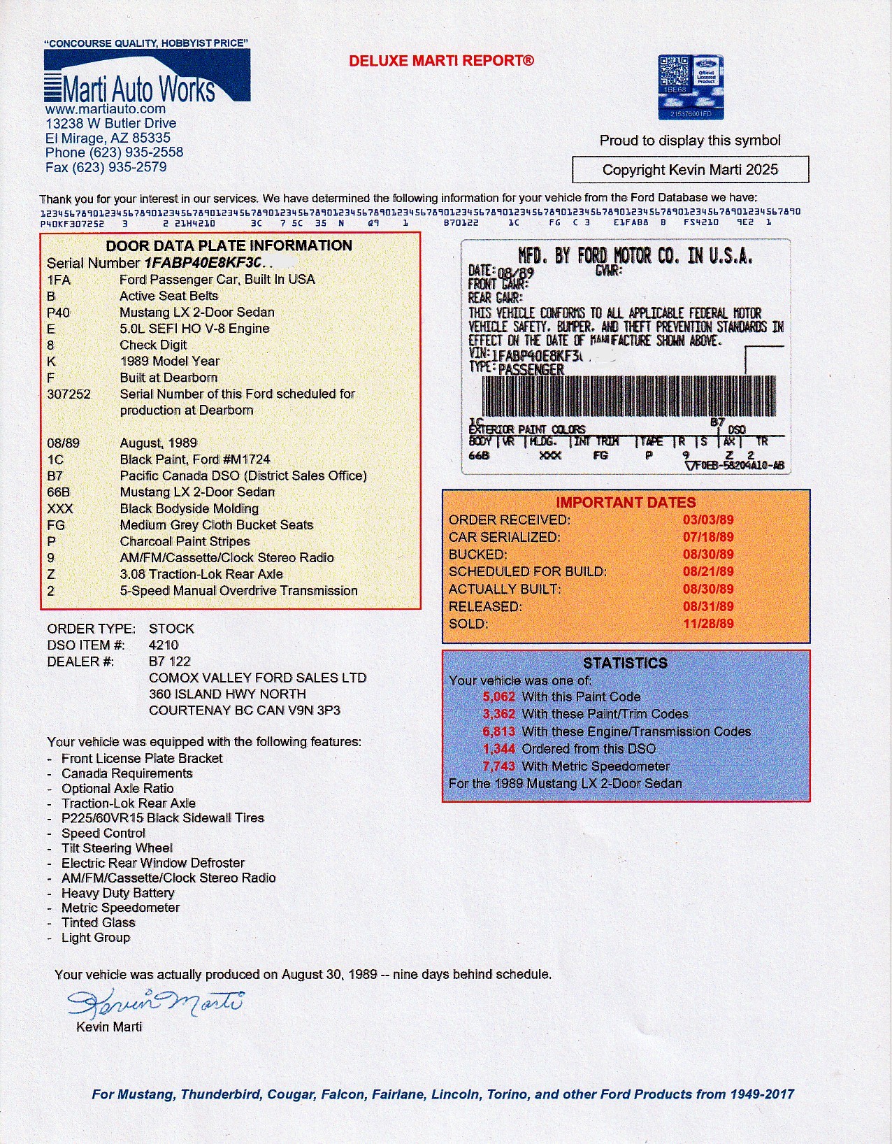 1989 Mustang 5.0 LX, EFI 302, TKO 5 speed, P/S, P/D/B, 3:55 Traction Lok, tilt steering, speed control, light package, AM/FM Cassette, rear defog, tinted glass, 18″ Centerline wheels, Steeda springs, rear tubular control arms, short throw shifter, BBK headers, BBK Air intake, Magnaflow cat back exhaust, engine balanced/ blueprinted and tuned, all new interior with alacantra headliner and package tray, 5 year ceramic coat paint finish, lifelong West Coast car, Marti Autoworks documented, original sheet metal car with all bar codes in place right through to the front grill, collector owned, car is turn key and in absolutely immaculate condition. Clean title, private sale not interested in trades, sale includes car cover and all related documentation. Enclosed/insured door to door transport arranged. Feel free to call me direct for further details at 778 386 1644.